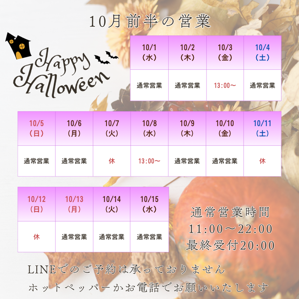 10月前半の営業 2025年9月28日 最終更新日時 : 2025年9月23日 calme-.- 祭りの日は規制等で交通状況が把握しづらいため 休業とさせていただきます。 10月もよろしくお願いいたします! 関連