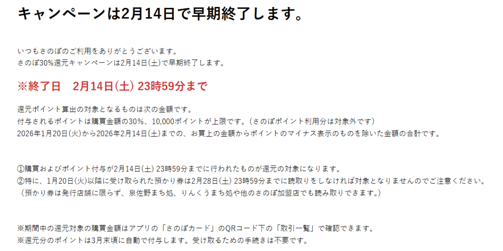 さのぽポイント還元祭終了日 2026年2月10日 最終更新日時 : 2026年2月10日 calme-.- 今回は早期終了です それに伴いCALME回数券の販売も終了いたします ご購入予定のお客さまは14日までにご来店ください お待ちしております 関連